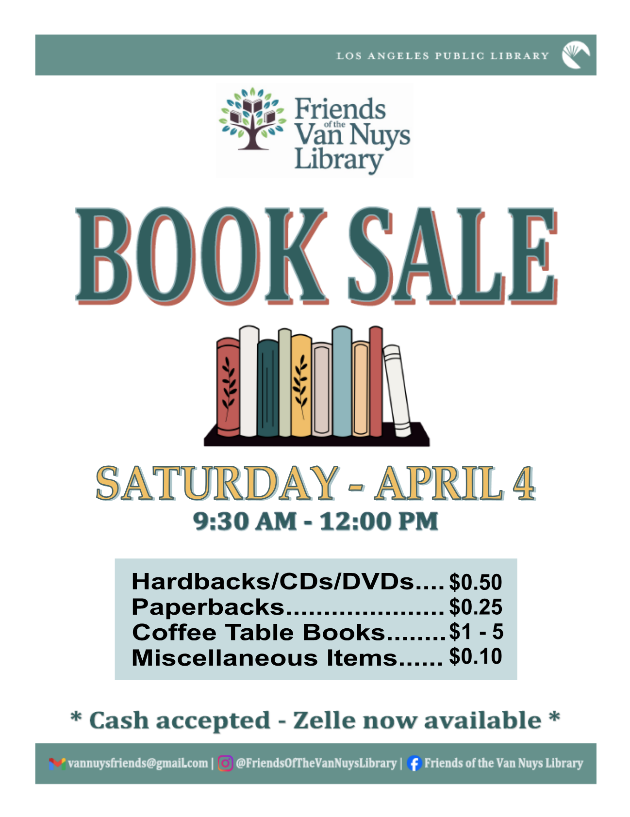A book sale is happening at the Van Nuys Library featuring hundreds of new books. Prices start at just 10 cents for paperbacks and go up to $5 for coffee table books. Cash and Zelle are accepted, and every purchase supports library programs for the community.
