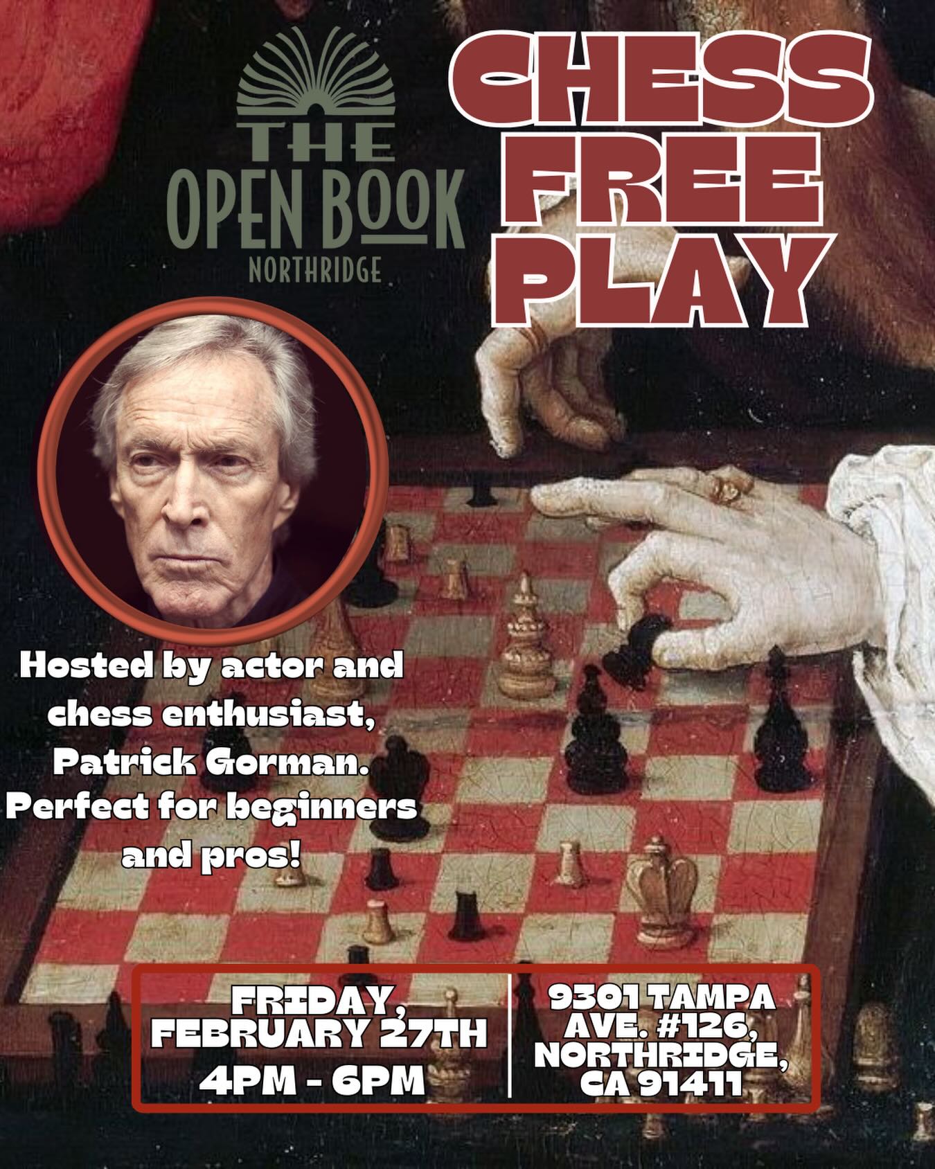 The Chess Free Play event at The Open Book Northridge features actor and chess enthusiast Patrick Gorman. Itβs a great opportunity for both beginners and experienced players to enjoy some casual chess. Expect a fun atmosphere and plenty of chances to meet fellow chess lovers.