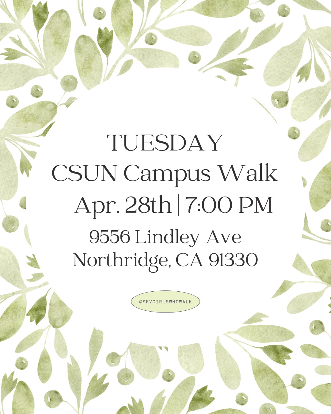 An evening walk around the beautiful CSUN campus awaits, perfect for unwinding and meeting new friends. The stroll features an easy-paced route, allowing for relaxed chatting and soaking in the evening vibes. Comfy shoes and good energy are recommended for this feel-good gathering.