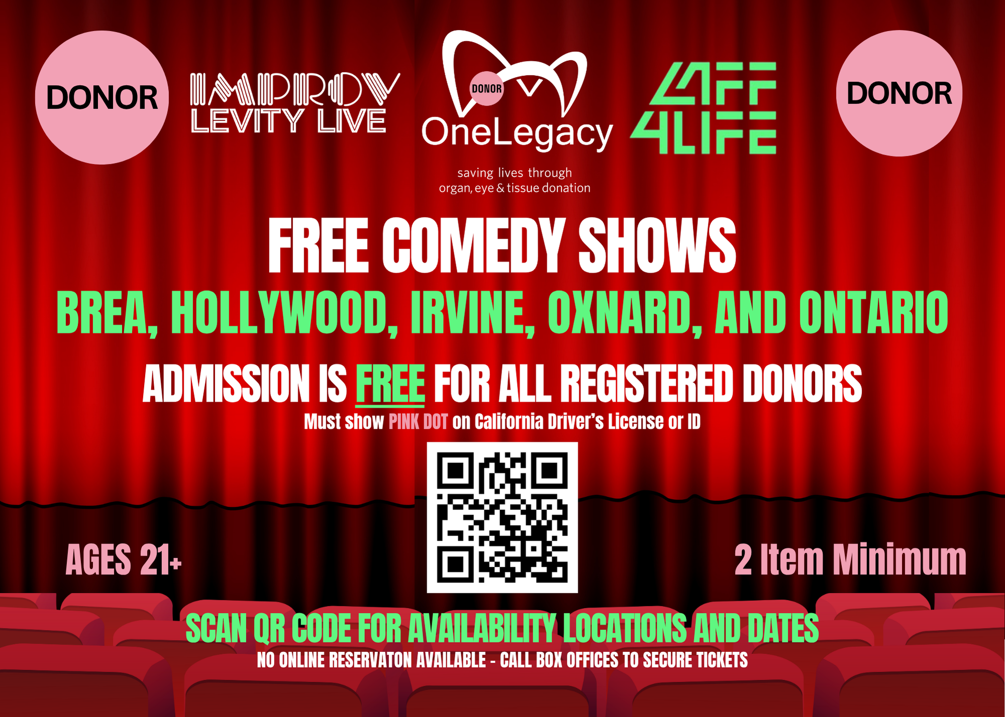A free comedy showcase featuring registered organ donors as the audience at comedy clubs. The event promises laughs and a unique experience for donors. It's a light‑hearted way to celebrate organ donation.
