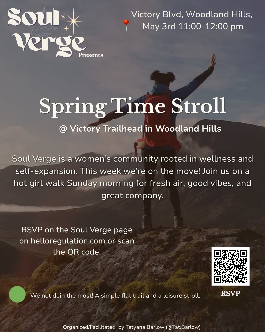 Soul Verge hosts a relaxed womenβs wellness walk where participants enjoy fresh air, good vibes, and conversation. Bring comfy shoes and stay hydrated; water bottles will be available at the end. Itβs a friendly, lowβkey stroll on a flat trail.