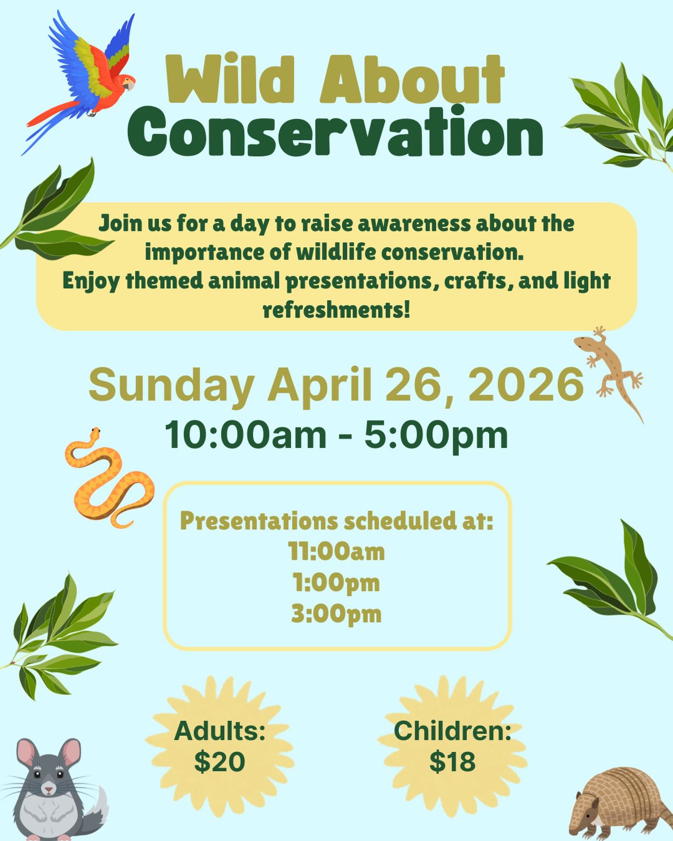 A fun day of animalβthemed presentations, crafts, and light refreshments that raises awareness about wildlife conservation. Itβs perfect for families looking for an engaging, educational experience.